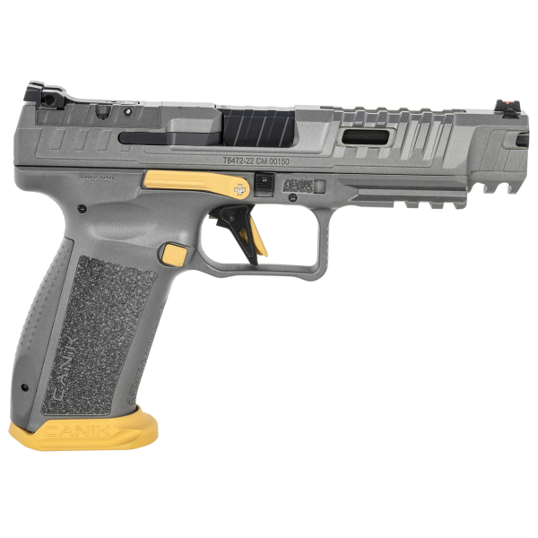 Canik HG6610TN SFx Rival Full Size 9mm Luger 18+1, 5″ Black Steel Barrel, Rival Gray Ported/Serrated Slide, Rival Gray w/Gold Accents Polymer Frame w/Beavertail & Picatinny Rail, Ambidextrous