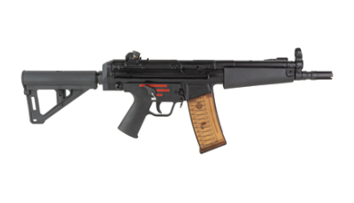 The AP53 Pistol is chambered in 5.56x45mm and features a semi-automatic, roller-lock delayed blowback action. It has passed NATO environmental tests for salt, fog, humidity, hot/cold, sand, and dust, and is produced by military manufacturer MKE.