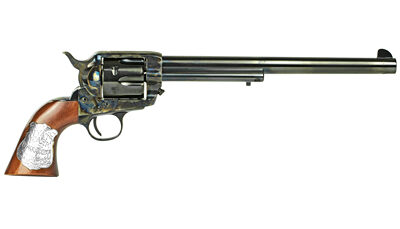 Made famous in the 1993 Western classic film Tombstone, this 10-inch barreled 1873 single-action revolver emulates the legendary sixgun attributed to lawman/gunman Wyatt Earp. Patterned exactly after the long-barreled peacemaker used in this classic horse opera, Cimarron’s unique revolver features the solid sterling silver Wyatt Earp, Peacekeeper presentation plaque neatly inlaid into the sixgun’s one-piece, walnut stock.