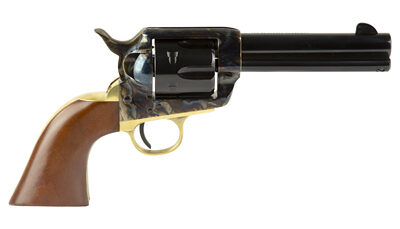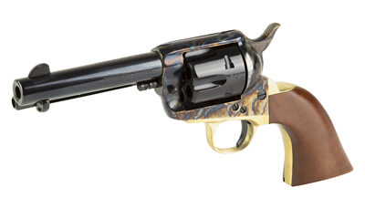 The Pistolero features a 4.75 inch blued barrel with a color case hardened receiver. Featuring a high polished brass backstrap and trigger guard gives this time piece a two-tone effect. All the screws are finished in a charcoal blue and the grips are a classic two-piece walnut.