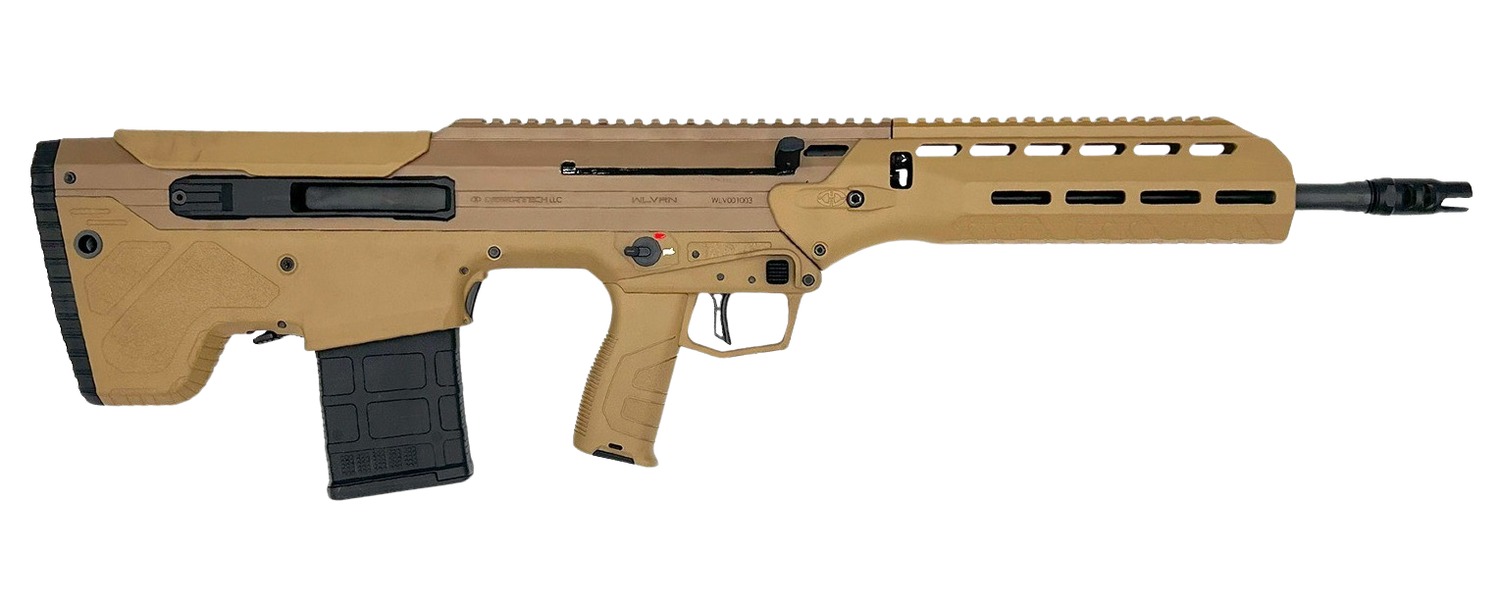 The Desert Tech WLVRN is a semi-automatic bullpup rifle utilizing an integrated receiver. The WLVRN features barrel mounting and clamping mechanism of the SRS & HTI family of precision rifles, the barrel mounting system is machined integrally into the receiver; full ambidexterity with ambi placements of the charging handle, mag release buttons, bolt catch and safety selectors; Ratchet Compensator and M-LOK accessory rail. Includes Magpul PMAG, WLVRN maintenance tool and user manual.
