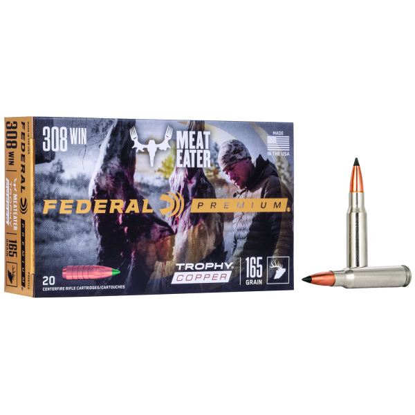 The Federal Premium loads start with the finest primers, which are subjected to more frequent inspections for dimensional tolerances and charge weight to ensure they deliver consistent ignition for every shot. Next is the propellants, which are specially formulated to meet Federal’s stringent specifications. These clean-burning powders are of the highest grades in the industry. They’re consistent and reliable. Lastly, the casing. The precision-built cases in most centerfire Premium loads feature nickel-plated brass that defeats corrosion and aids in sleek, smooth extraction in even the most extreme conditions.Extract maximum performance from your favorite cartridge with Trophy Copper, the official rifle ammunition of MeatEater’s Steven Rinella. The loads provide pinpoint accuracy and aggressive expansion, yet the copper, polymer-tipped bullet retains up to 99 percent of its weight for deep penetration on a wide range of medium and big game. Specifications: 308 Win/165 gr/Trophy Copper (TC)/20 Per Box/10 Cs