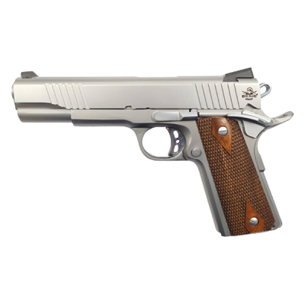 The Rock Standard full size Pistol built in traditional classic Series 70 design and delivered with their top Quality Production and Engineering Standard. Chambered in .45 ACP with 5″ button rifled Barrel. The Slide has a Double Wide Slant Serration and with traditional Roll Over Ejection Port. Slide and Frame are Stainless and all exposed Parts are matte chrome SAE 4140 high grade steel. Front/Rear Sight allow for quick draw in fast need situation. Includes skeletonize Hammer, Beavertail Grip Safety and Ambidextrous Safety Lock which is standard in the Rock Series. Grips is a double diamond checkered wood. Rock Island Amory Pistol, comes with crisp factory 4-6 pound trigger pull. Making it a great experience right out of the box.