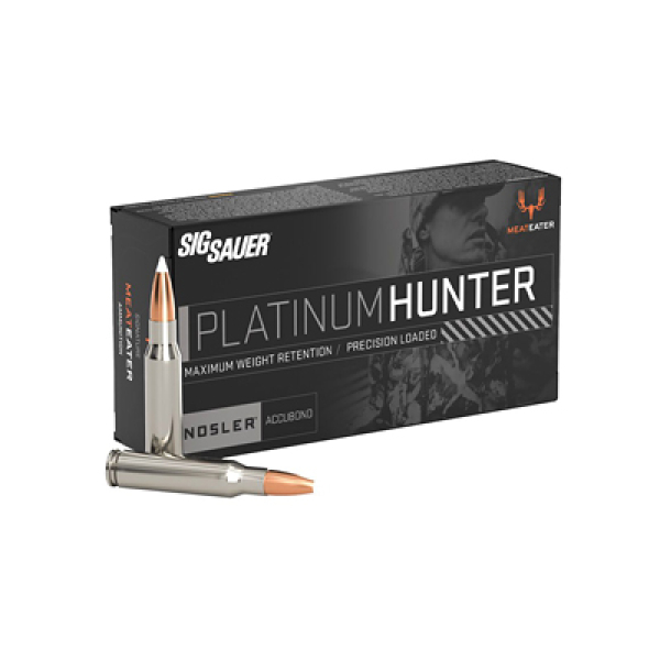 The Sig Sauer Platinum Hunter line of ammunition was created in partnership with the hunting experts at Meateater. This premium offering is precision-loaded with a Nosler Accubond projectile, delivering unmatched weight retention and deep penetration on big game. Each round is enclosed in a corrosion-resistant nickel case for smooth cycling, ensuring reliability in all conditions. And with waterproofing for extreme weather resistance, nothing will stop you from making the perfect shot.