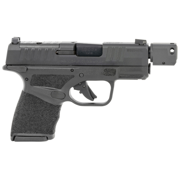 Springfield Armory micro-compact Hellcat features an extended magazine bumps up the round count to 13; a hammer forged threaded steel barrel w/compensator; unique top slide serrations to maximize your grip on the slide; non-proprietary accessory rail allows you to accessories with your favorite light and/or laser; manual safety; Tritium/Luminescent front sight, Tactical Rack U-Notch rear sight; reversible mag release, manual safety and pressure activated grip texture. Includes two magazines and zippered case.