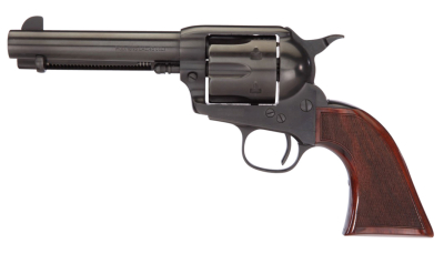 The Runnin’ Iron has proven to be a favorite of mounted and ground shooters alike. It features a low-and-wide hammer spur, checkered one-piece walnut grip, and a wide trigger. This 45LC model is Taylor Tuned which features hand polishing and custom springs. It has a black rock nitride barrel, cylinder, and frame finish, 4.75″ barrel, and fixed blade front sight with notched rear.