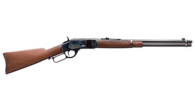 This Competition Carbine configuration of the lever-action Model 1873 rifle with barrel band, color case hardened carbine buttplate, saddle ring and walnut stock. This particular model gives cowboy action shooters even more to be excited about, as it comes ready-for-competition with extras that improve speed and accuracy on the firing line. The most notable enhancement is the action that has been tuned for speed-as is the Winchester way. Specifically, the action has been performance-tuned and modified with a shorter, smoother lever stroke to make cycling faster when you’re competing against the clock.